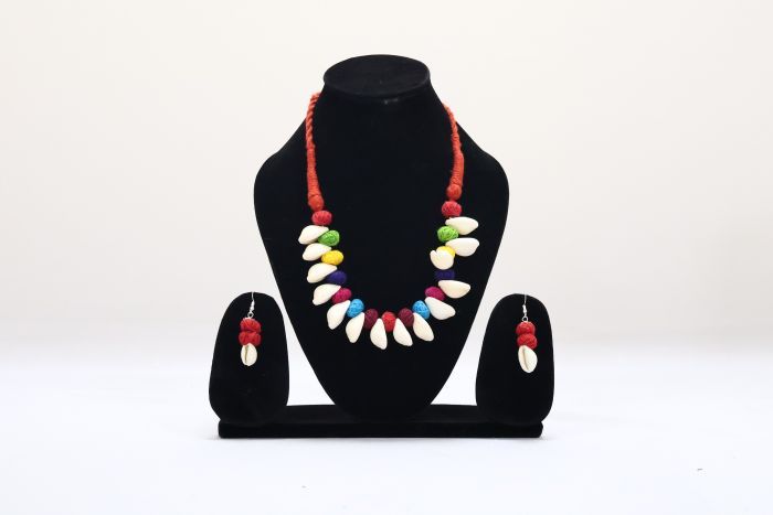 Capture the essence of coastal beauty with this handcrafted sea shell necklace, featuring natural shell elements strung on a vibrant red cotton dori. Designed for both comfort and style, this lightweight piece is perfect for adding a boho or earthy touch to your outfit. Whether worn casually or on festive occasions, it stands out as a statement accessory. Made by skilled SHG artisans, this necklace not only enhances your look but also supports traditional craftsmanship and sustainable livelihoods.