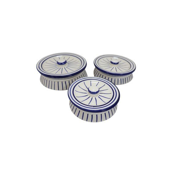 Introducing Saras Aajeevika's Khurja Pottery Donga 3-Piece Set – Line 8 (White and Blue)