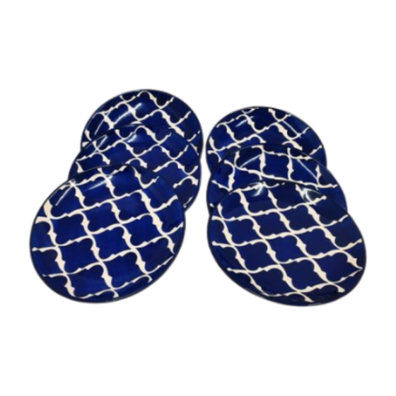 Add a touch of tradition and elegance to your dining table with this Set of 6 Full-Size Khurja Pottery Plates in a deep, elegant blue finish. Each 11-inch plate is handcrafted by women artisans from Falak SHG, Uttar Pradesh, using a signature blend of clay, feldspar, and quartz that naturally glazes the surface.