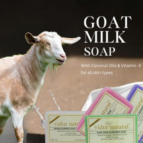 Indulge in the goodness of nature with this set of four luxurious Vidur Natural Goat Milk Soaps. Each soap is crafted with 125gm of pure goat milk, enriched with nourishing ingredients like Aloe Vera, Lavender, Rose, and Kesar Almond. Experience the gentle cleansing and moisturizing benefits of these handcrafted soaps. Pamper your skin with the natural goodness of Vidur.